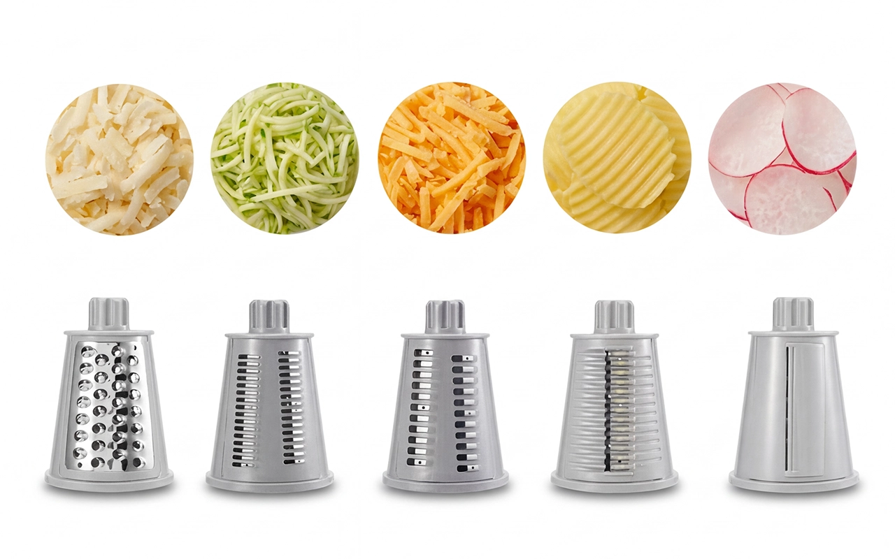 Tauschen Sie fünf scharfe Trommeln zum Reiben, Schneiden, Julienne-Schneiden oder Waffeln. Bereiten Sie in Sekundenschnelle Cheddar, Krautsalat, Zucchinistreifen und Dessert-Toppings zu.