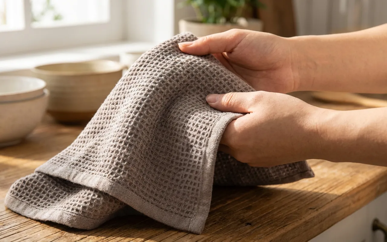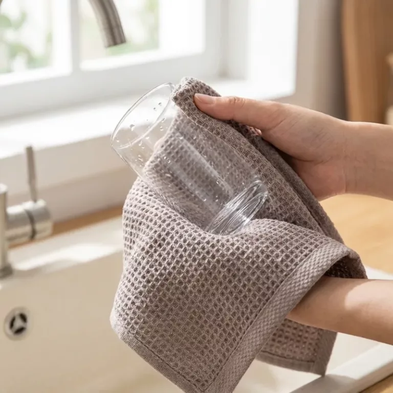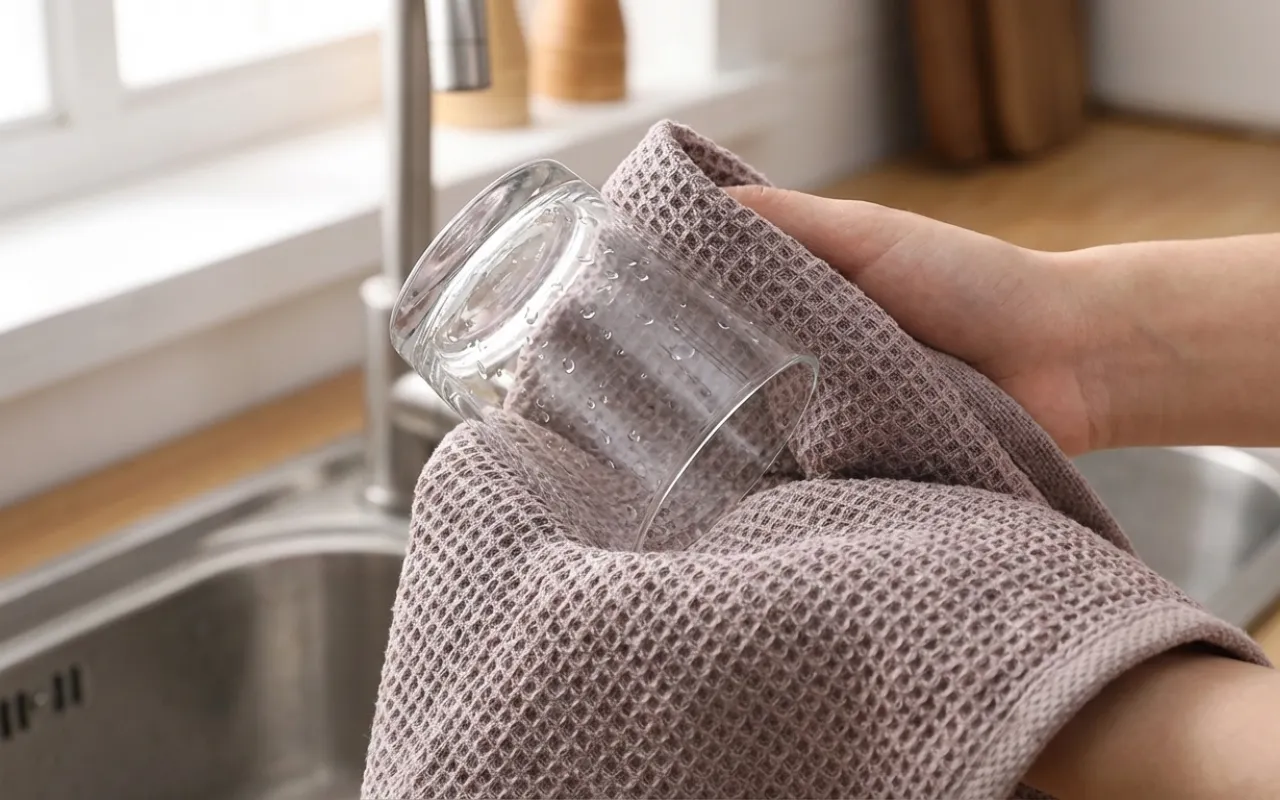 Dichte Waffeltaschen ziehen Feuchtigkeit ab und lassen Gläser wunderschön glänzen. Arbeitsflächen bleiben sicherer vor stehenden Pfützen, sodass weniger Ausrutscher passieren.