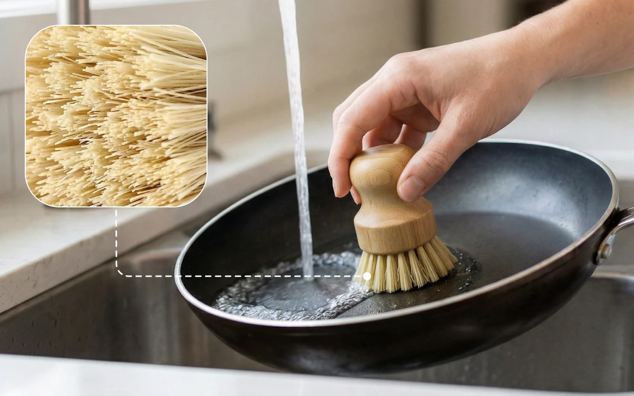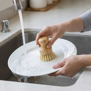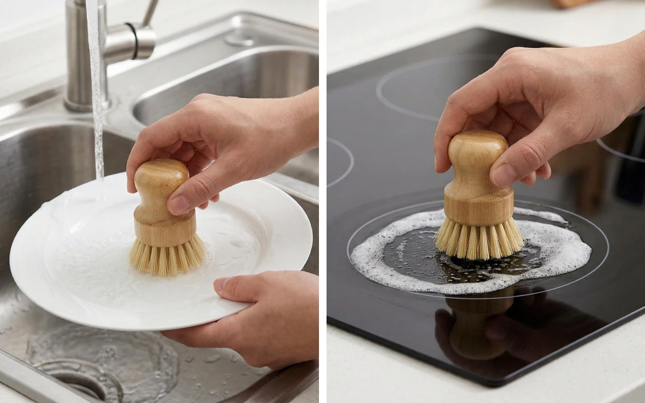Der Bambusgriff fühlt sich glatt an, rutscht nie und schont meine Finger, wenn ich einen großen Stapel Geschirr spüle. Feste Borsten lösen festgeklebte Essensreste mit wenig Aufwand.