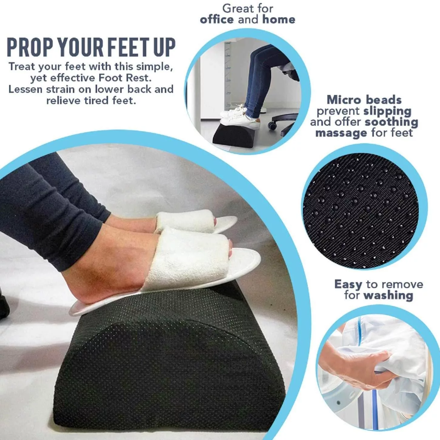 Die rutschfeste Unterseite unseres Fußstützenkissens mit Mikroperlen aus Gummi bietet hervorragenden Halt auf den meisten Oberflächen, wie Fußböden oder Teppichen. Bei der Verwendung unter dem Schreibtisch verrutscht oder zerkratzt es den Boden nicht. Das Feet Rest Cushion ist sehr langlebig. Ideal für Schuhe, Socken und Bärenfüße. Sie können es jederzeit verwenden: bei der Arbeit, beim Sitzen zu Hause oder im Büro, beim Schlafen im Bett oder auf Reisen mit dem Flugzeug und im Auto.