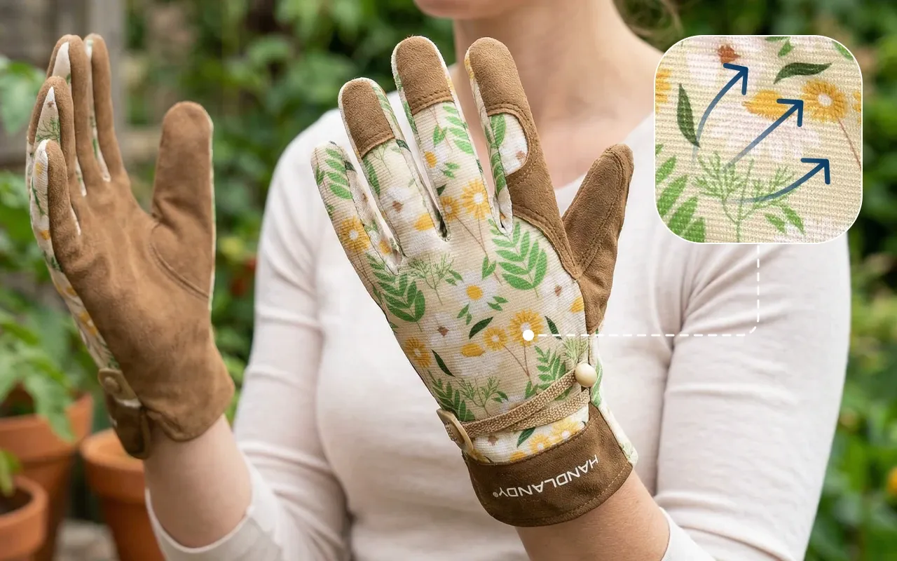 Elastischer Stoff ermöglicht freie Fingerbewegung zum Binden zarter Stängel. Luftiges Material reduziert Schwitzen, sodass die Handflächen bei der Arbeit frischer bleiben.