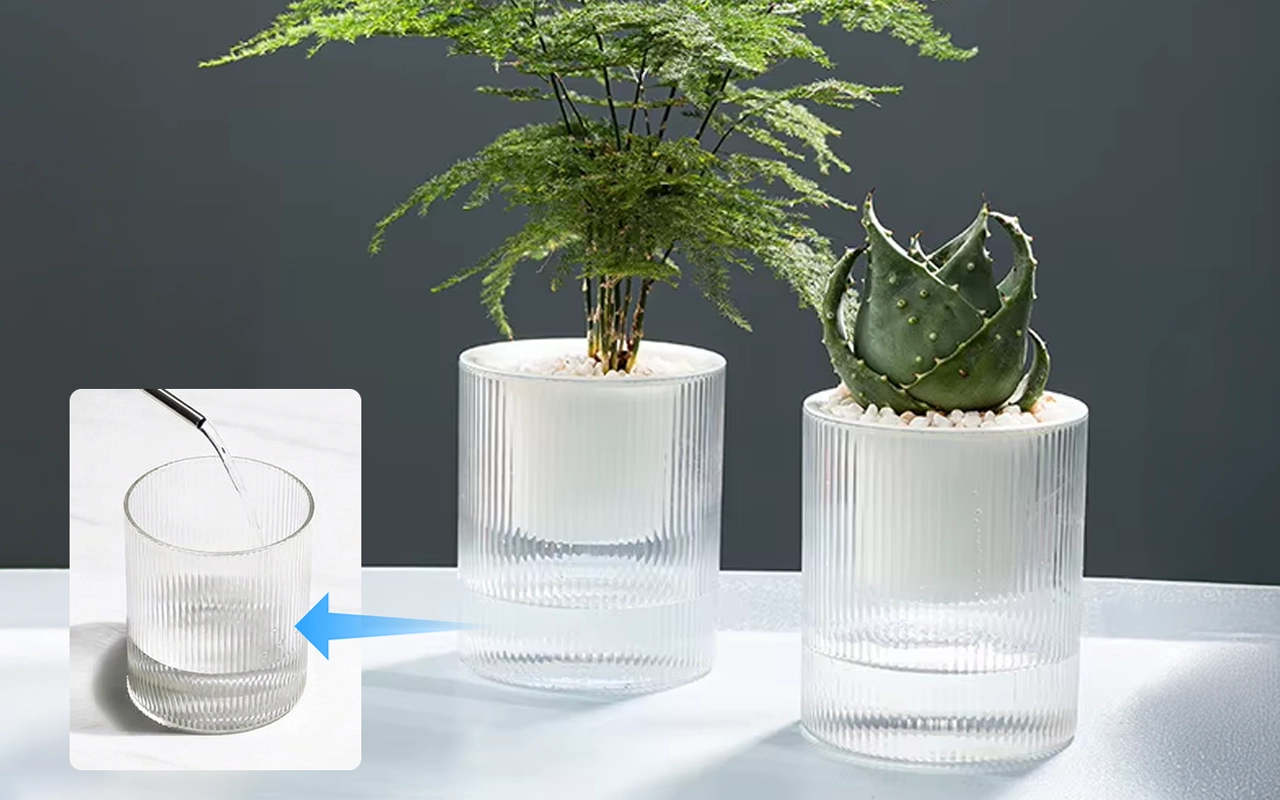 Eine transparente Basis speichert Feuchtigkeit und versorgt die Wurzeln gleichmäßig. Sichtbare Füllmarkierungen erleichtern das Nachfüllen und vermeiden Rätselraten.