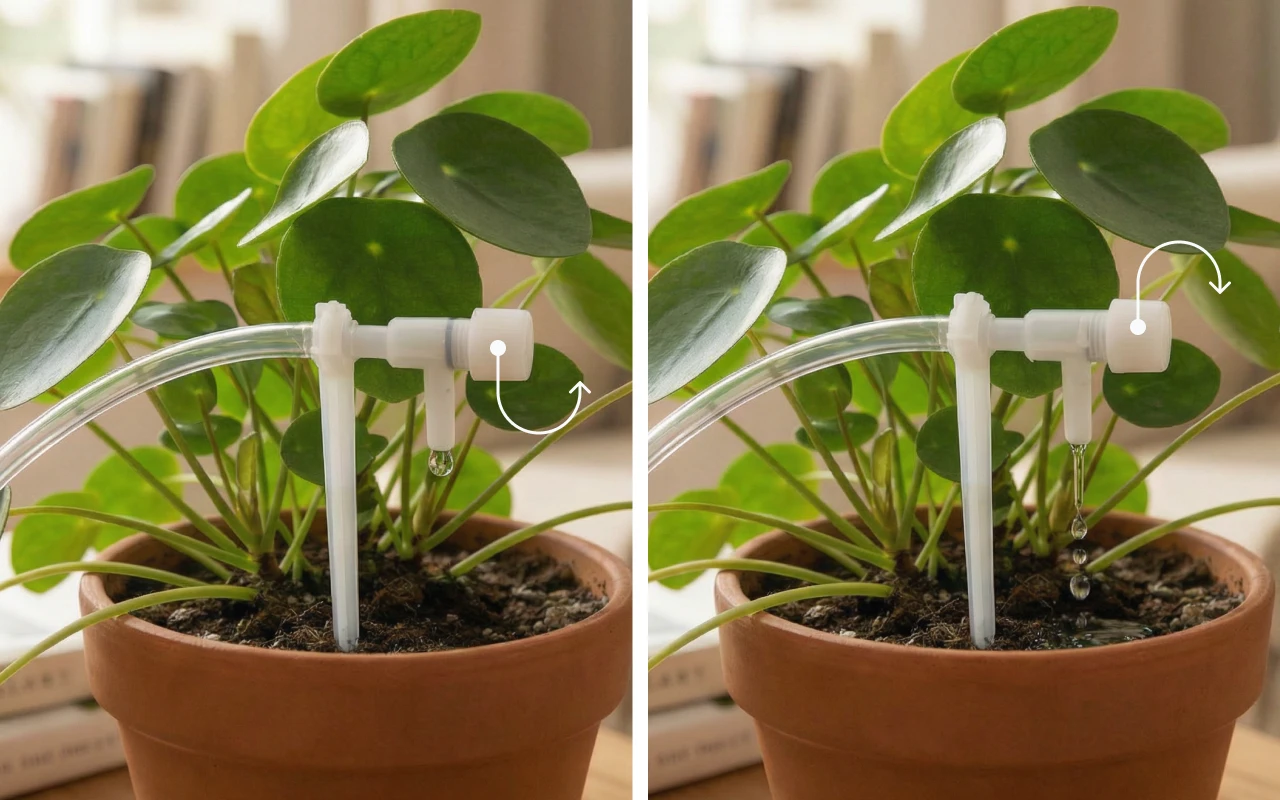Drehen Sie den Regler, um sanfte Tropfen einzustellen. Jede Düse versorgt die Wurzeln gleichmäßig und reduziert trockene Stellen.