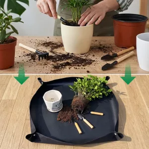 Verhindern Sie, dass Erde über Tische, Teppiche und Küchenfliesen verstreut wird. Die Nygex-Umtopfmatte bildet eine ordentliche Arbeitsfläche. Erhöhte Ränder fangen Kompost, Wasser und losen Kies auf. Sie sind schneller fertig und können sie anschließend ganz einfach abwischen.